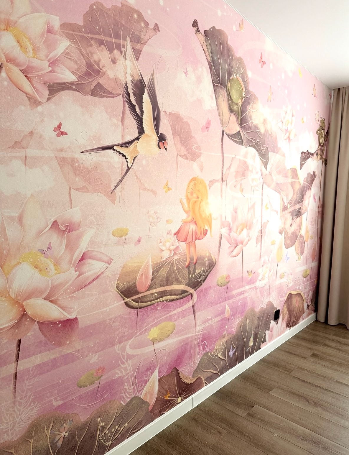 ECO фреска от Ортограф с изображением Дюймовочки оказалась приятным и небанальным решением для детской комнаты. Рисунок выполнен в гармоничных тонах, создает спокойную, сказочную атмосферу. Ребенок в восторге, а это, пожалуй, главный показатель!